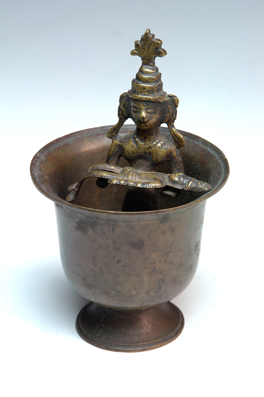 A NEPALESE BRONZE CEREMONIAL CUP, centre containing two figures, 13.9cm high