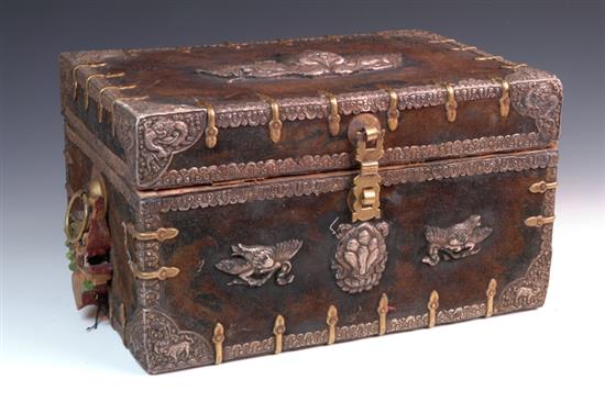 AN UNUSUAL TIBETAN WOODEN DOWRY BOX, applied repousse silver trimmings, top and sides mounted with Garuda and flames motif, interior decorated with painted mandala and inset with a coral and a turquoise, painting faded 35.5 x 22 x 20cm