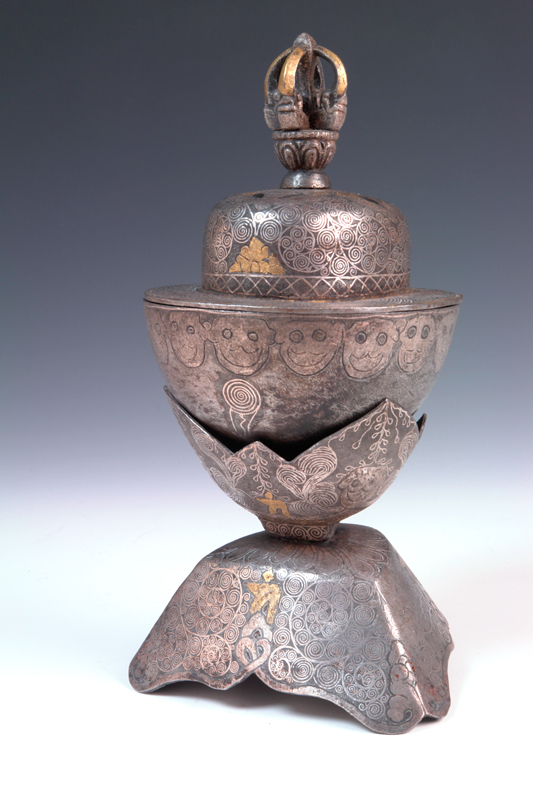 A FINELY WORKED IRON KAPALA, a half Vajra finial, with niello scroll work and designs, 22.8cm high