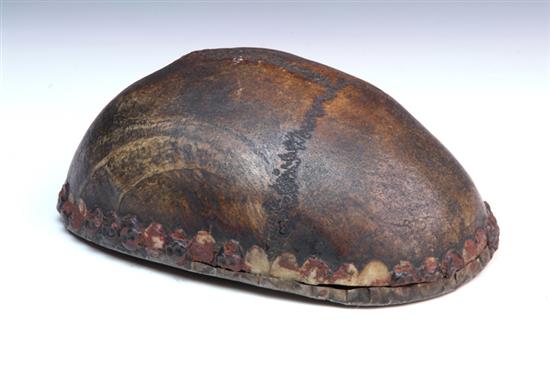 AN OLD TIBETAN KAPALA SKULL CAP, silver lined and edged, tiny silver skulls applied to outer edge, losses to applied skulls, 17 x 12 x 6cm