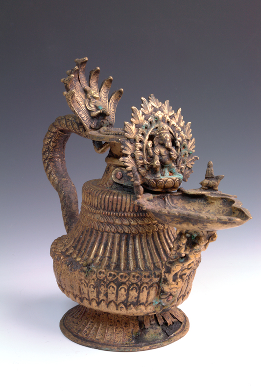 A NEPALESE OIL LAMP, the brass handle a Krishna with myrobalan fruit in front of cobra hood of heads, loss to foot, 26cm high
