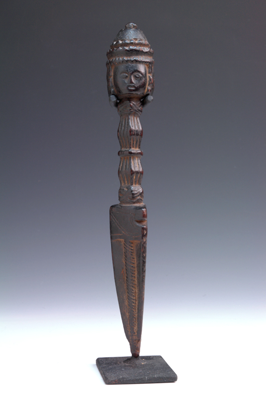 TWO WOOD CARVED FIGURAL PHURBAS, stylized snake carved to both lower daggers, largest 30cm high
