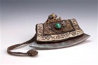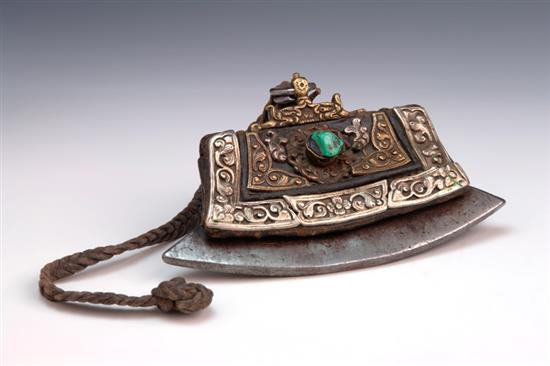 TWO TIBETAN STRIKING IRONS, one inset with coral the other with turquoise, the largest 14cm wide