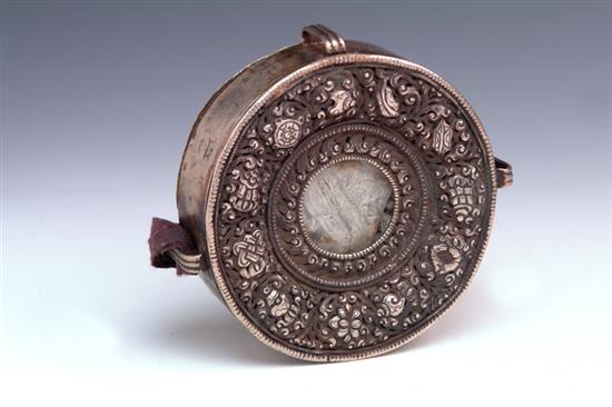 A ROUND SILVER GAHU AMULET BOX, raised auspicious symbols around a glass centre, inside prayers on paper, 9cm diameter