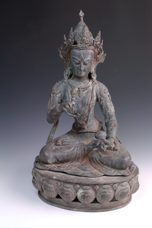 A NEPALESE BRONZE BODHISATTVA, vajra and bell in hands, seated on lotus pedestal, 44.5cm high