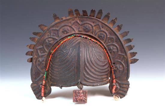 A NEWAR TRIBE CEREMONIAL HEADGEAR, embossed copper, a small gahu amulet pendant at forehead, applied beadwork to crown