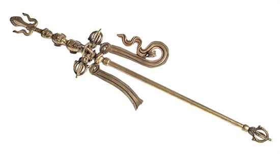 A BRASS KHATVANGA CEREMONIAL STAFF, at top Trisula above 2 heads and one skull, in centre visvavajra with ceremonial scarf, at end a half vajra, 63.5cm high