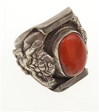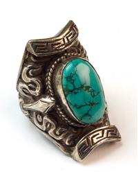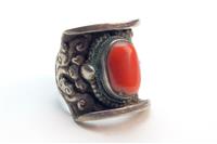 THREE TIBETAN SILVER SADDLE RINGS, two inset with coral cabochon and other with turquoise