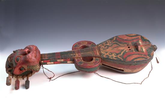 A POLYCHROME TIBETAN/NEPALESE MUSICAL INSTRUMENT, old painting, a stylised figure head at top, curved arms at sides, 73.5cm