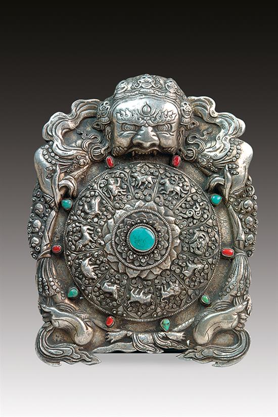 AN ELABORATE SILVER MANDALA, Bhavacakra with animals of the zodiac around central flower with a large turquoise in centre, bordered by ten alternating corals and turquoises, silver back with suspension ring and a central Visvavajra symbol, 29 x 22cm