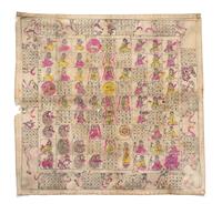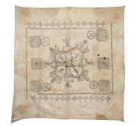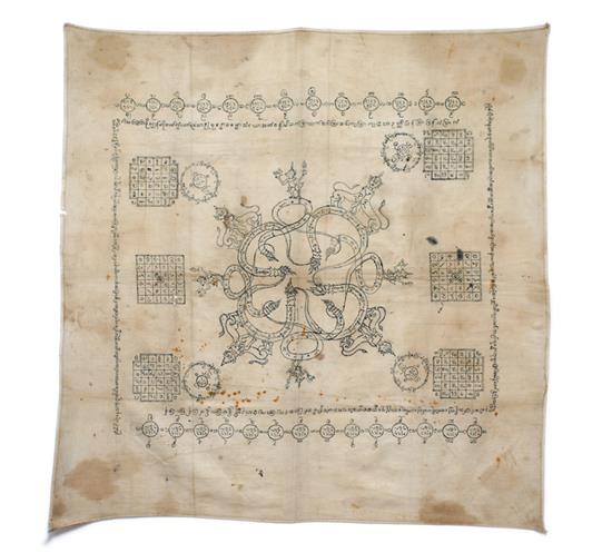 A BURMESE TRIBAL WITCHDOCTOR'S OUTFIT, jacket, square head cover and magic square placed in front of diviner.