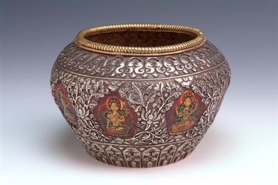 A SILVER HOLY WATER VESSEL, repousse floral motif, eight cartouches with diety figures, 8.8 x 12.5cm