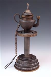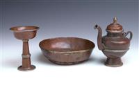A GROUP OF CEREMONIAL ITEMS, including conical offering vessel, four piece ceremonial staff set, metal staff, oil lamp, three piece home altar set, vishvavajra and charm mould. The metal ceremonial staff 33cm long.