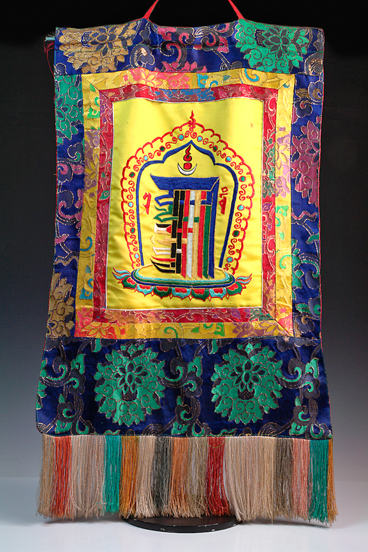 AN EMBROIDERED BROCADE THANGKA, with red, yellow and blue brocade trimmings with fringes, 76 x 43cm