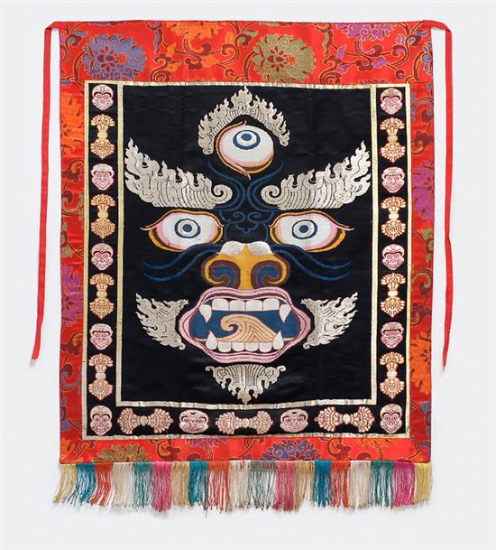 A TIBETAN DANCE APRON AND NEPALESE DANCE MASK, both with brocade trimmings, apron with central Mahakala, 94cm long including fringe