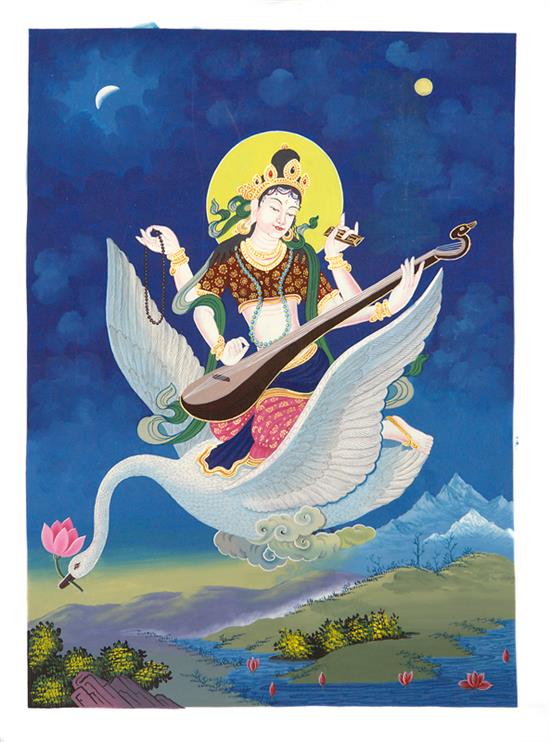 A PAINTING OF SARASVATI, patron of music, with her Sitar, and seated on her swan, 44.5 x 31.5cm