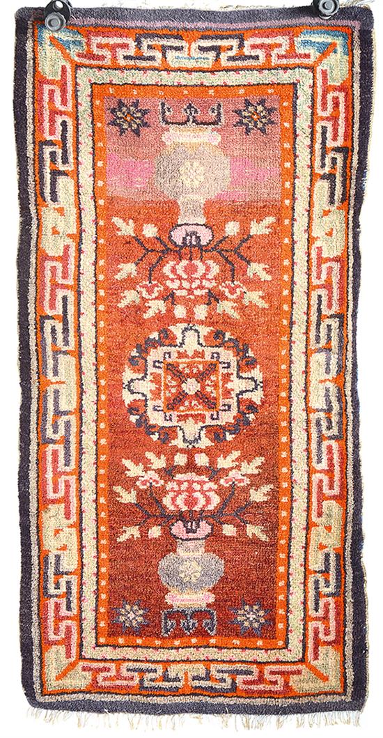 A TIBETAN RUG, geometric border, with central flower vase motif, 135 x 64cm excluding tassles