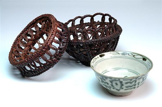 A 19TH CENTURY YAO TRIBE PLAITED RATTAN CASE CONTAINING PORCELAIN CUP, slight chip missing at edge, case 11cm high, cup 11cm across.