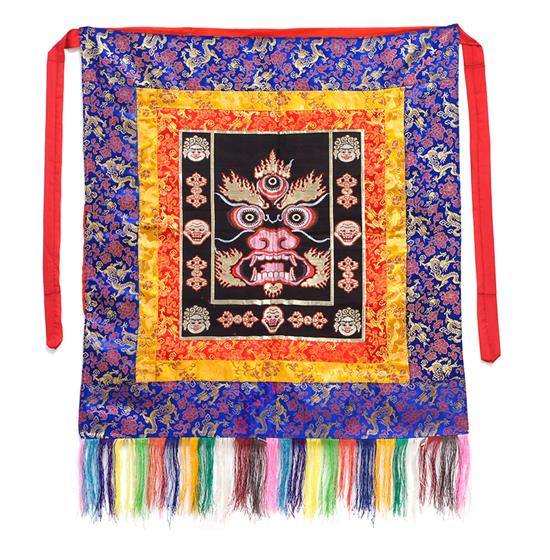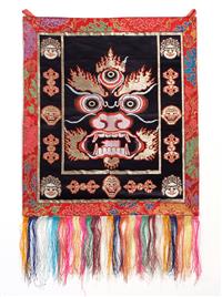 TWO SIMILAR TIBETAN DANCE APRONS, both with brocade trimmings and central Mahakala, the largest 73cm x 68.5cm