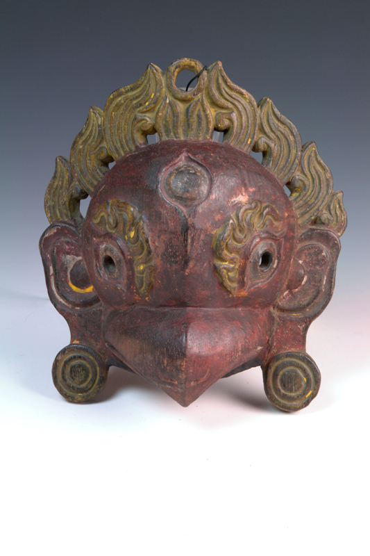 A NEPALESE GARUDA DANCE MASK, open eyes, flame eyebrows and ears, reverse hollow, 22.5 x 20cm