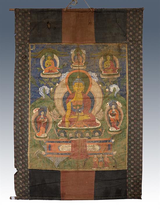 A LARGE THANGKA, BUDDHA, in preaching pose, at top three different poses, at sides a standing figure, 106.5cm x 68.5cm