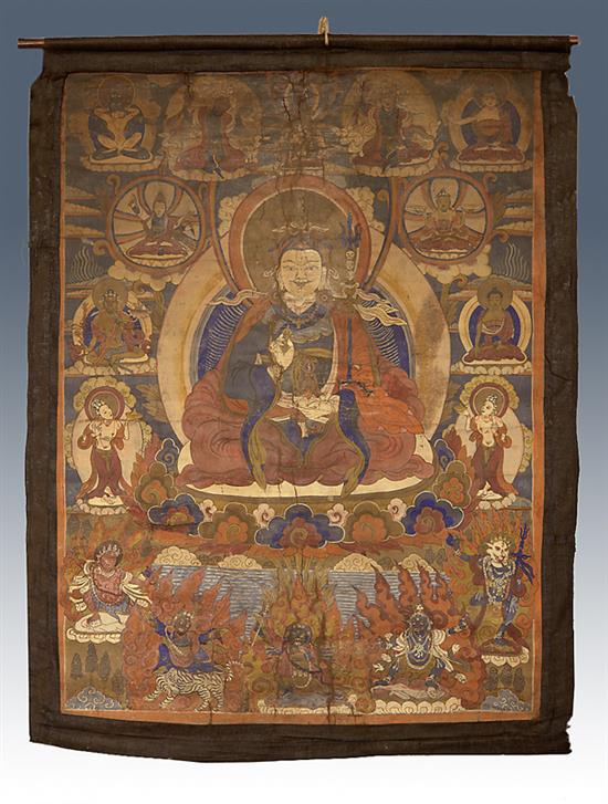 A LARGE THANGKA, PADMASAMBHAVA, surrounded by deities, throne above a stylised mountain, frame missing, 83cm x 63.5cm