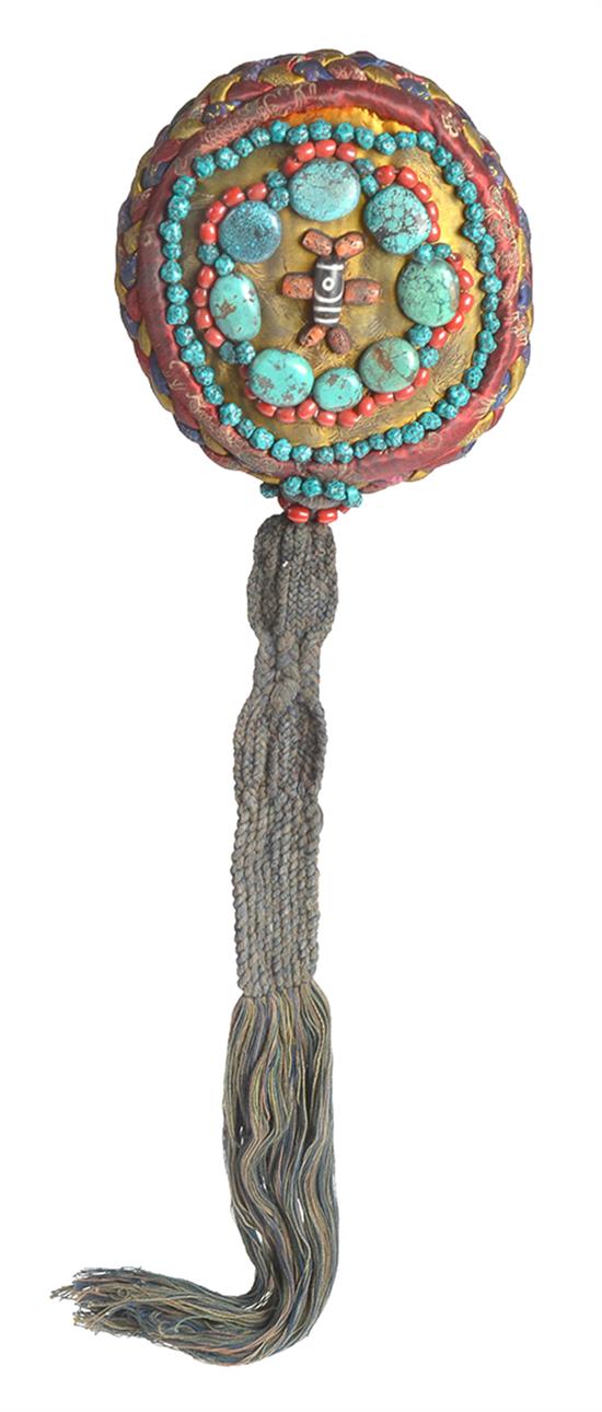 AN ELABORATE TIBETAN CAP, set with large red corals and turquoises, a braided cotton pigtail at back