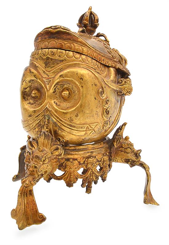 A GILDED CEREMONIAL KAPALA SKULL ON TRIANGULAR BASE, hand gilded, detailed face, a half Vajra finial, housed on triangular base ending in yali head feet, 20cm long at base