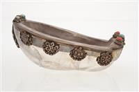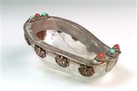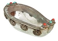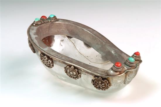 A RARE ROCK CRYSTAL KAPALA CEREMONIAL BOWL, edged with silver, inlay with large red corals and turquoises, eight auspicious symbols below silver rim, loss to one ratna, 16 x 10 x 6cm, 10cm crack to crystal bowl