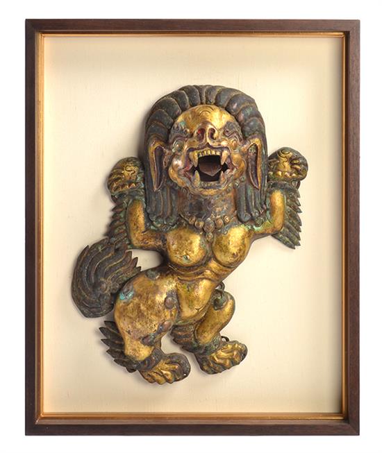 A PAIR OF GILDED COPPER SNOW LIONS, from an arch above a temple door destroyed by Chinese soldiers, housed in later frame, 38cm high, measured without frame
