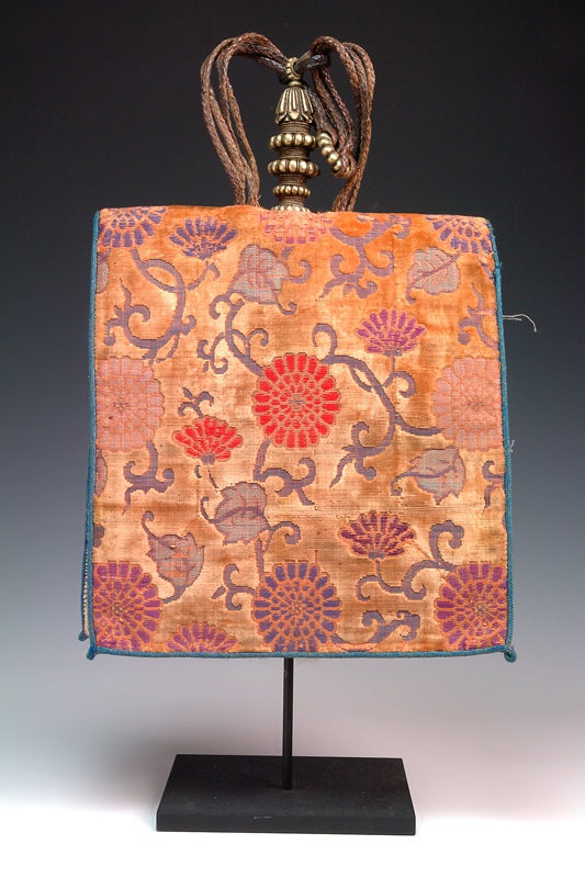 A TIBETAN LAMAS HOLY WATER CONTAINER, small copper bottle with elaborately turned brass stopper, housed in blue hand-woven flaps, covered by floral brocade flaps