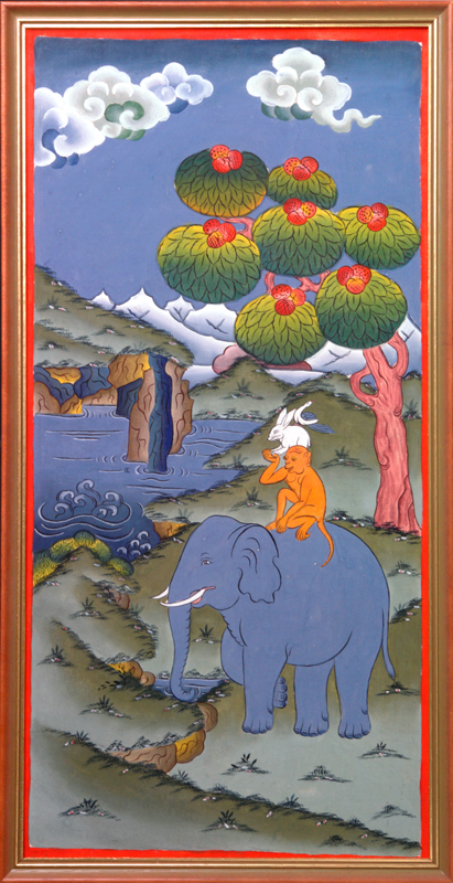 A BHUTANESE PAINTING, depicting an elephant, monkey, hare and bird under a tree, 55cm x 28cm, measured with frame