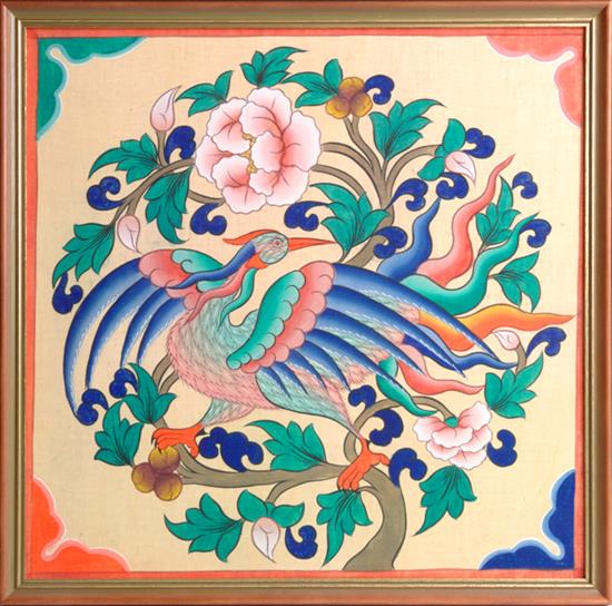 A BHUTANESE PAINTING, PHOENIX AMOUNG PEONIES, 35cm x 36.5cm, including frame