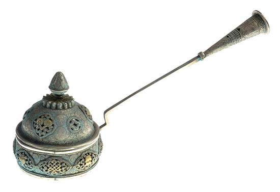 A SILVER INCENSE BURNER, three open work auspicious symbols, lotus bud finial, acanthus leaf motif to handle, 22.5cm long
