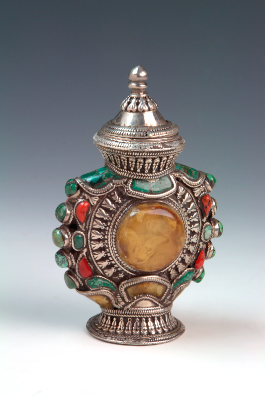 A TIBETAN SILVER SNUFF BOTTLE, a large central amber cabochon both sides, inlay with red corals and turquoises, domed lid with spoon