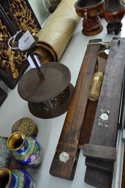 FOUR ASSORTED KOREAN ITEMS, including weaving implement, 18th century oil lamp, flaying knife and cookie mould, the latter 49.5cm long