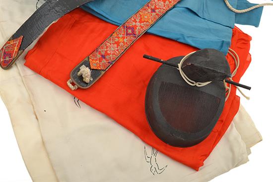 A JAPANESE KABUKI COSTUME SET IN BOX, faults to box, 72 x 42cm