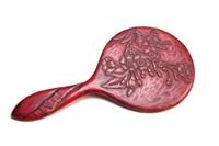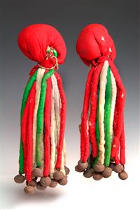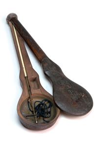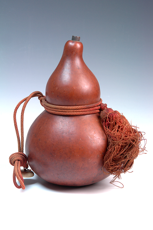 A COLLECTION OF JAPANESE ACCESSORIES, including ladies purse, horse carriage decorations, silver lock, portable scales, drinking calabash, lacquered hand mirror, fly whisk and temple gong. The calabash measures, 25.5cm high