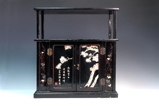 A BLACK LACQUER CABINET, with mother of pearl inlay, a large tree with leaves extending over both doors, 45.5 x 43cm