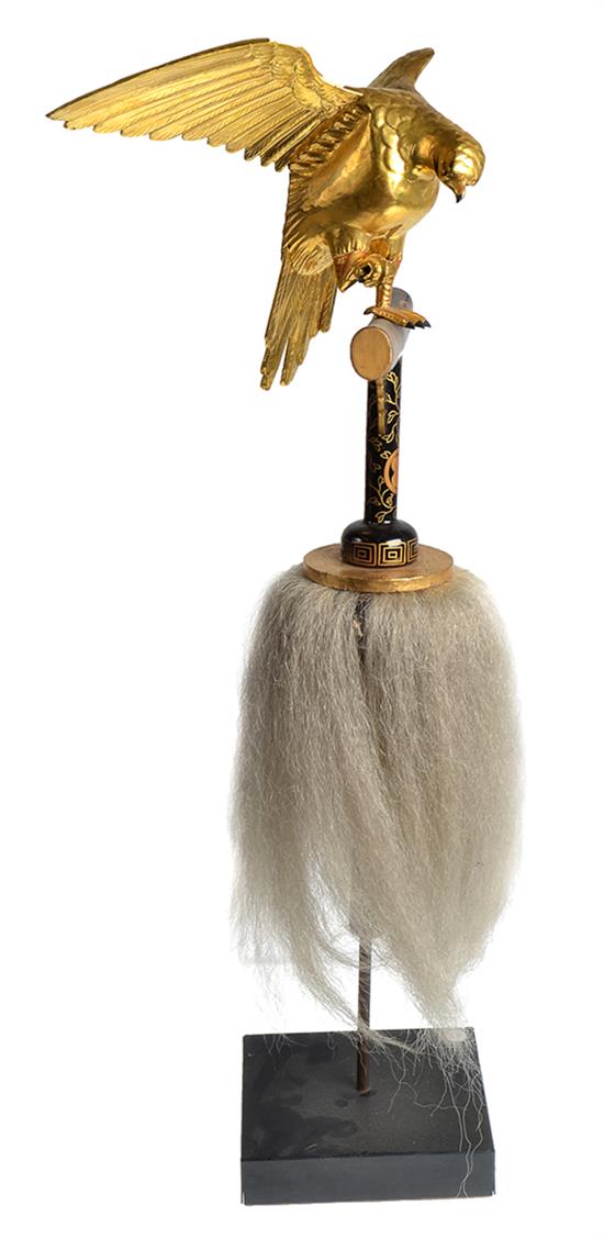 AN ELABORATE SPEAR COVER, black lacquer with gold painting, above a golden hunting falcon finial, horse hair skirt underneath, 69.5cm total height
