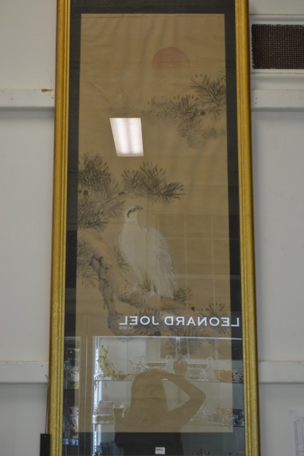 A FRAMED JAPANESE SCROLL, a white falcon, on a pine branch, rising sun above, signature at lower left, 142 x 58cm with frame