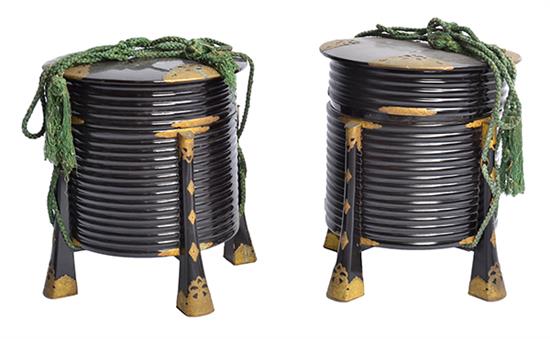 A PAIR OF HOKKAI LACQUER MARRIAGE BOXES, fine metal trimming on body, legs & lid, green cord closure and suspension, 43cm high
