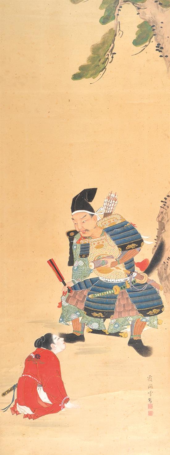 A LARGE 19TH CENTURY FRAMED PAINTED SCROLL, Samurai returning home and welcomed by his devoted wife, 100 x 36cm without frame