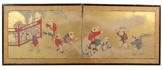 A 19TH CENTURY PAINTED AND GILDED SCREEN IN TWO PANELS, KARAKO, each panel measures 85 x 61cm , restored