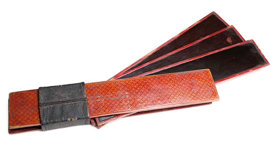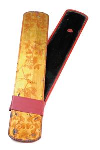 TWO 19TH CENTURY LACQUERED MESSAGE STAFFS, one gold lacquered exterior with cherry blossom motif, the other gilded orange exterior with interlocking circle motif, both with leather cuff closure, largest 38cm x 6cm