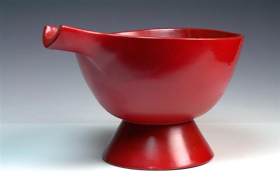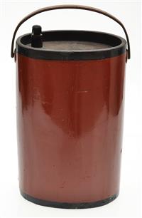 TWO LACQUER ITEMS, red keg with thick copper handle, and footed pourer. The keg 55.5cm high