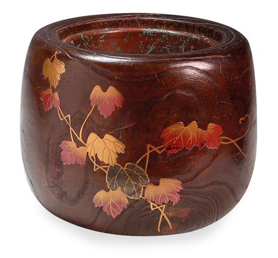 A LACQUERED PAULOWNIA WOOD HIBACHI, gilded foliate motif, internal copper lining for charcoal, 20cm high, 22.5cm across top