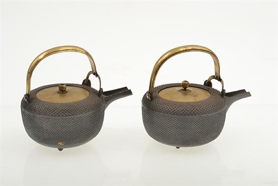 A PAIR CAST IRON TETSUBINS, brass handles & lids with knobbed motif, 17.5cm high each including lid