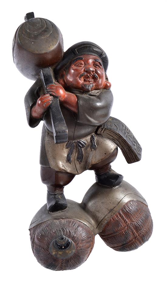 A COLD PAINTED BRONZE FIGURE, DAIKOKU, smiling face, a large hammer on shoulder 24cm high