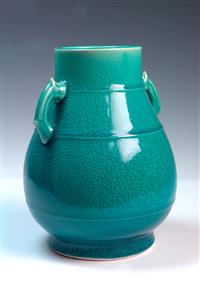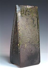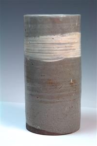 SEVEN PIECES OF JAPANESE POTTERY, including gilded rotund koro, two Shigaraki ware vases, tamba pottery sake container, shino glazed bowl, turquoise glazed pot and snake skin style glazed vase The sake container 33cm high.